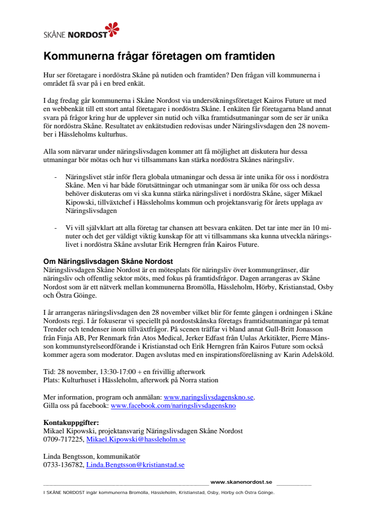 Hur ser företagare i nordöstra Skåne på nutiden och framtiden? Den frågan vill kommunerna i området få svar på i en bred enkät. Resultatet redovisas under Näringslivsdagen den 28 november i Hässleholms kulturhus.