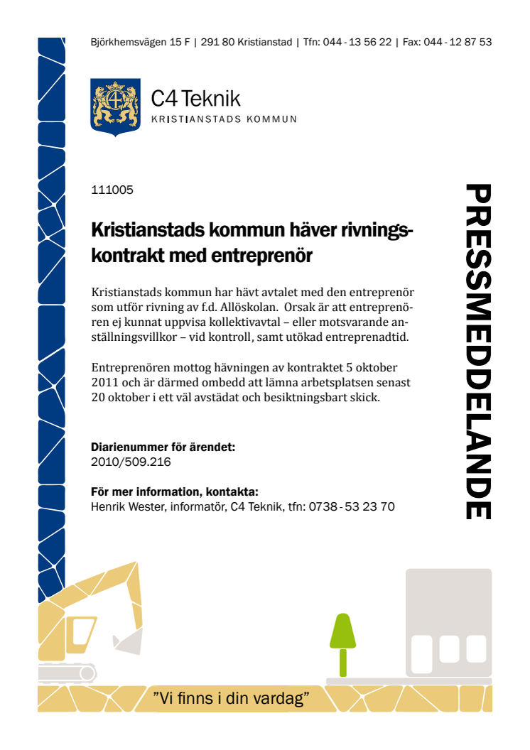 Kristianstads kommun har hävt avtalet med den entreprenör som utför rivning av f.d. Allöskolan. Orsak är att entreprenören ej kunnat uppvisa kollektivavtal – eller motsvarande anställningsvillkor – vid kontroll, samt utökad entreprenadtid.