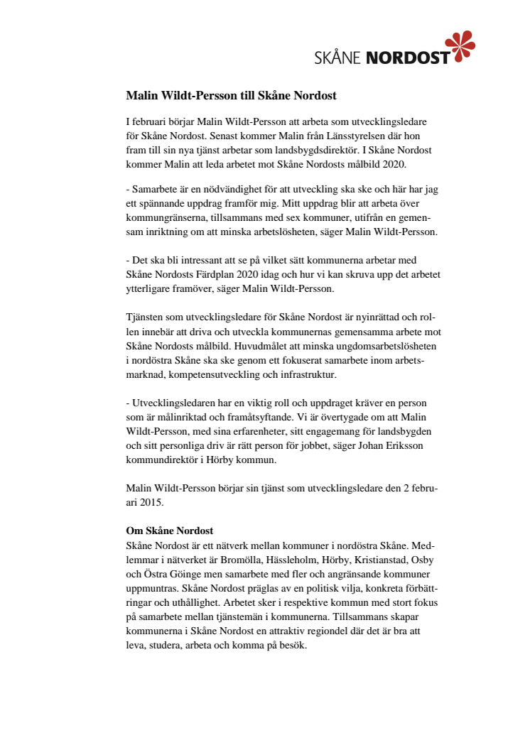 I februari börjar Malin Wildt-Persson att arbeta som utvecklingsledare för Skåne Nordost. Senast kommer Malin från Länsstyrelsen där hon fram till sin nya tjänst arbetar som landsbygdsdirektör.
