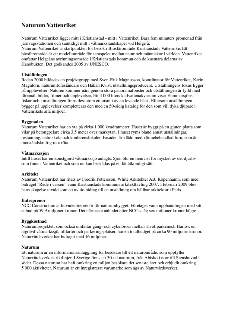 Naturum Vattenriket öppnar 27 november mitt i Kristianstad - mitt i Vattenriket - faktaunderlag