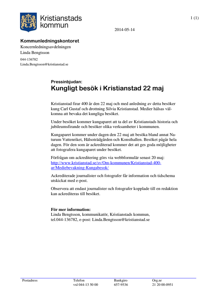 Kristianstad firar 400 år den 22 maj och med anledning av detta besöker kung Carl Gustaf och drottning Silvia Kristianstad. Medier hälsas välkomna att bevaka det kungliga besöket.