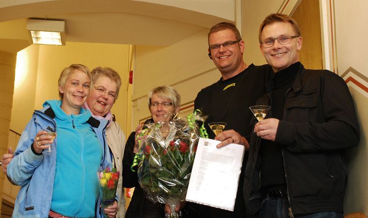 Hustrun Sara Nilåzen, mamma Lena Nilsson och camparen Pia Börjesson från Landöns campingförening överraskade med cider och blommor när den nya campingarrendatorn Johnny Nilåzen och enhetschefen Staffan Johansson från Kristianstads kommuns tekniska förvaltning C4 Teknik kom ut med det undertecknade kontraktet.