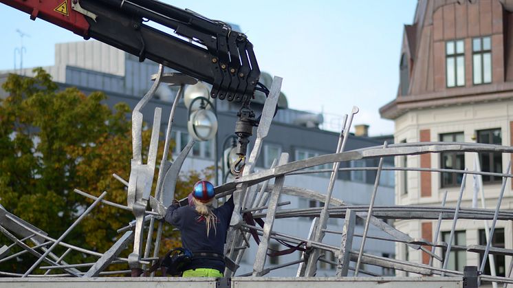Konservatorn Helena Strandberg har med varsam hand tagit bort kalk, smuts och mossa från stålskulpturen, som nu blänker lika mycket som då den sattes på plats i december 1966.